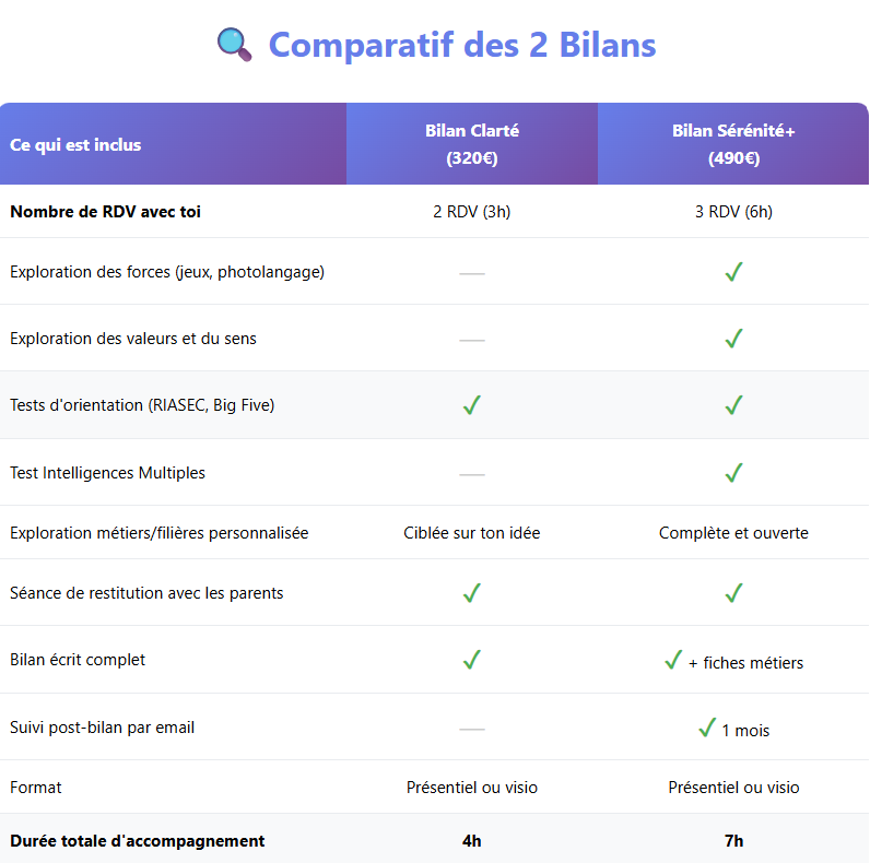- RDV 4 (1h) : Restitution avec tes parents : bilan complet, pistes concrètes, stratégie d’orientation personnalisée